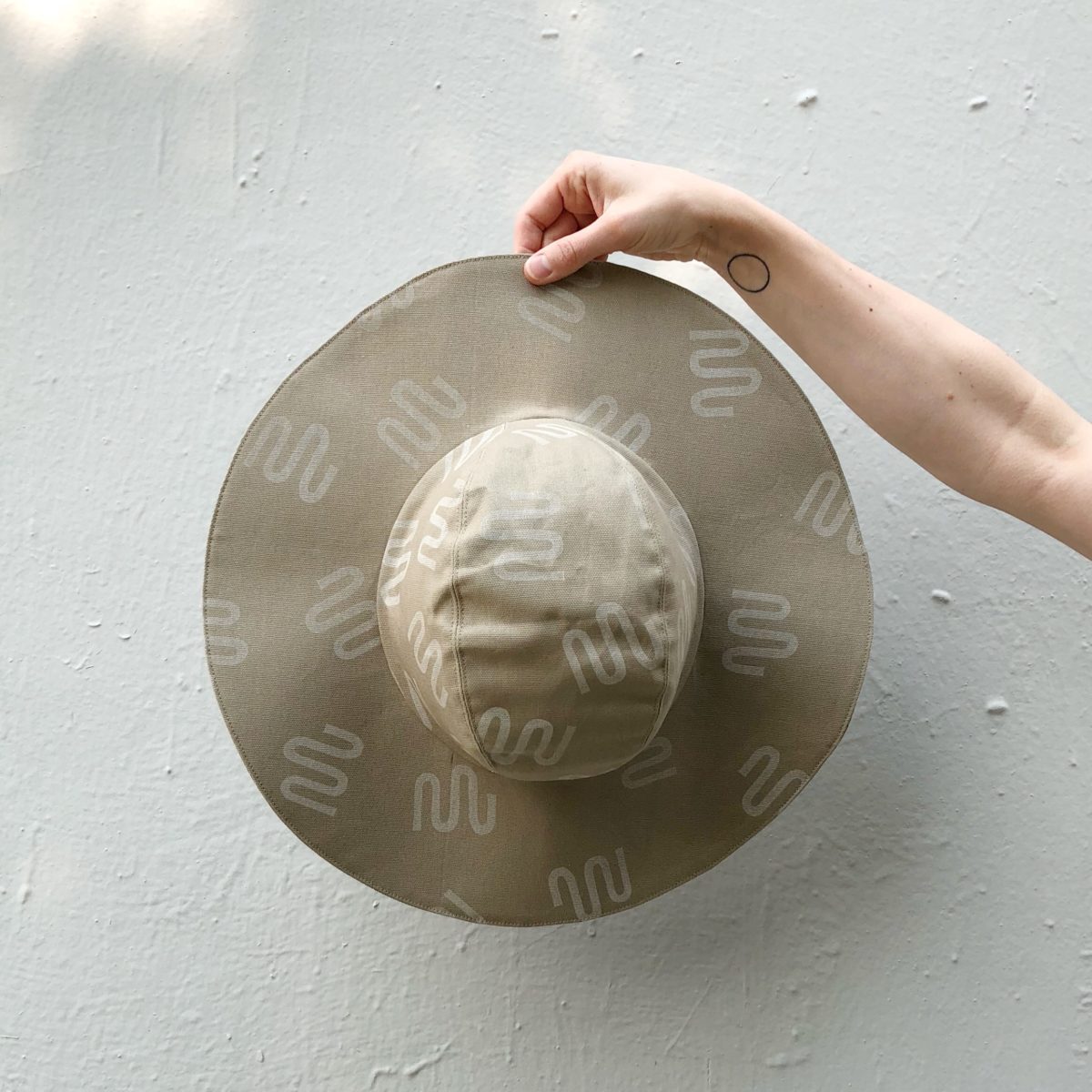 I block printed khaki canvas from Joann Fabrics and used this free pattern. My hat is a size large with a 4″ brim. It was a super fast and easy make!