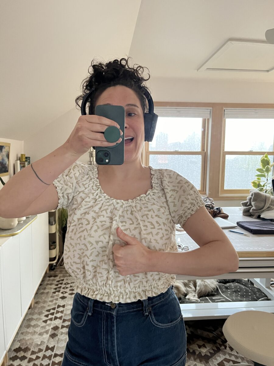 Next, was this top. It’s the Seamwork Aims and while it looks flipping cute on others, I’ve learned I don’t feel great in tops with even the slightest amount of poof at the shoulders. But I wanted to finish it, even if it ultimately gets donated. It needed the hem and placket stitched, plus buttons and buttonholes. It’s a little yeehaw but I’m kinda into it?