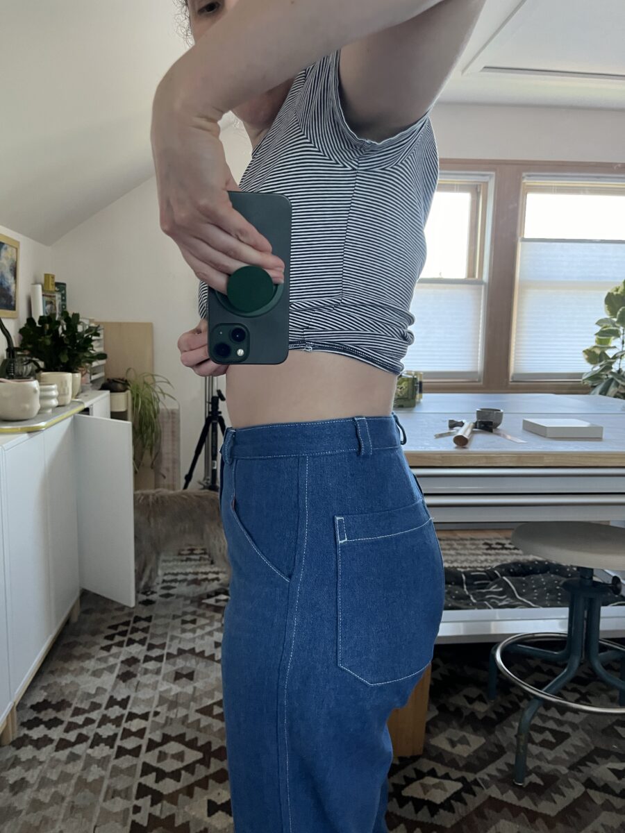 The following weekend I was still riding the WIP pile high and decided to fix the fit on these Shop Pants. Despite previously making these in the same fabric (just a different dye) the fit was completely different at the back waist. I had also placed the back belt loop off center and was happy to have the opportunity to fix it. I took about an inch out of the center back and was able to hide all the backstitching under the belt loops. I’m so excited to have another pair since I wear this pair all the time!