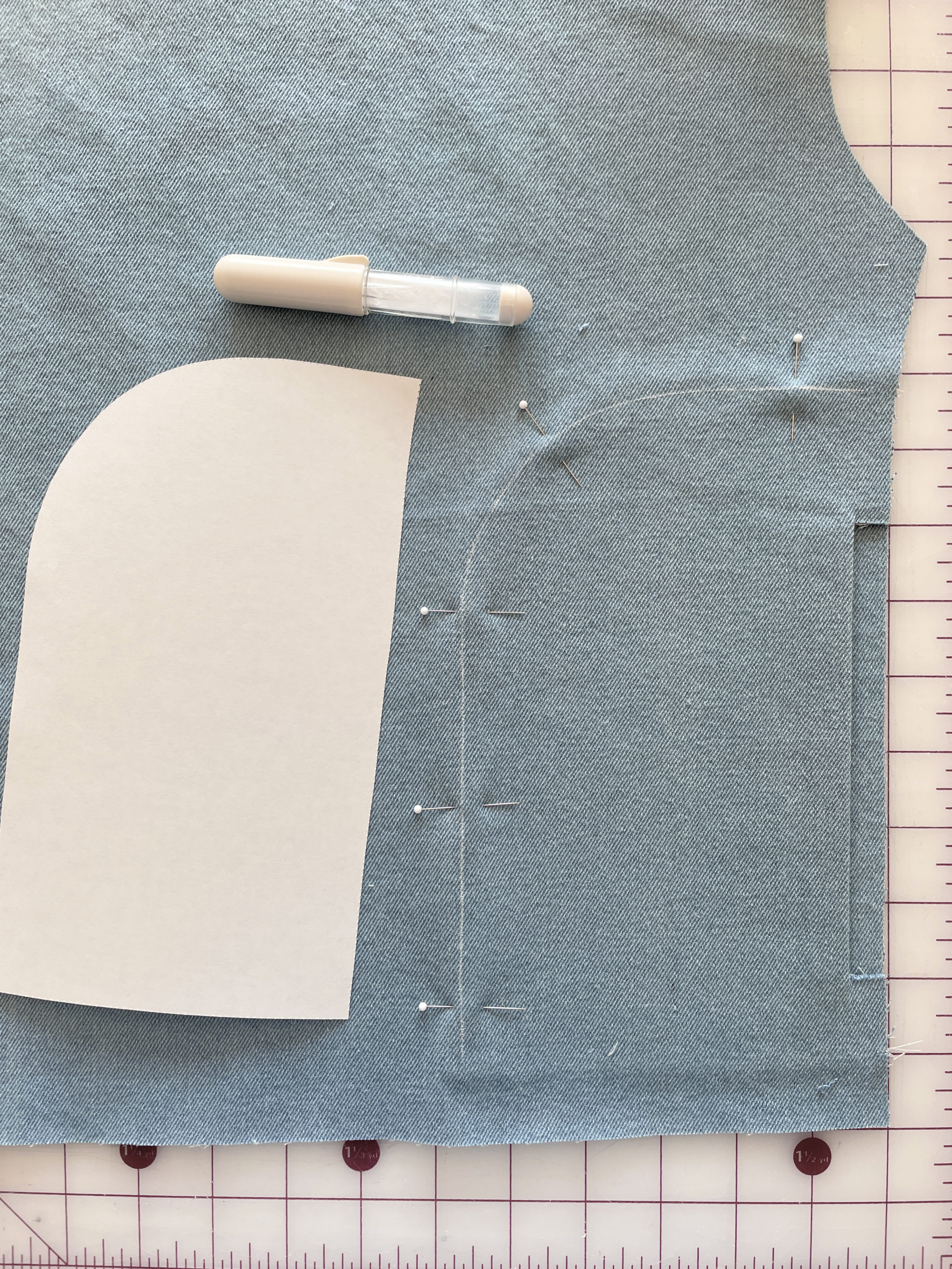 - Make the buttonholes on the placket before installing. I used a 10oz denim so the seams were THICK. I can’t quite remember which two I made first but ultimately I had to change the direction of one set, so the top two are vertical and the bottom two are horizontal. Even with my compensation plate, my machine was struggling.