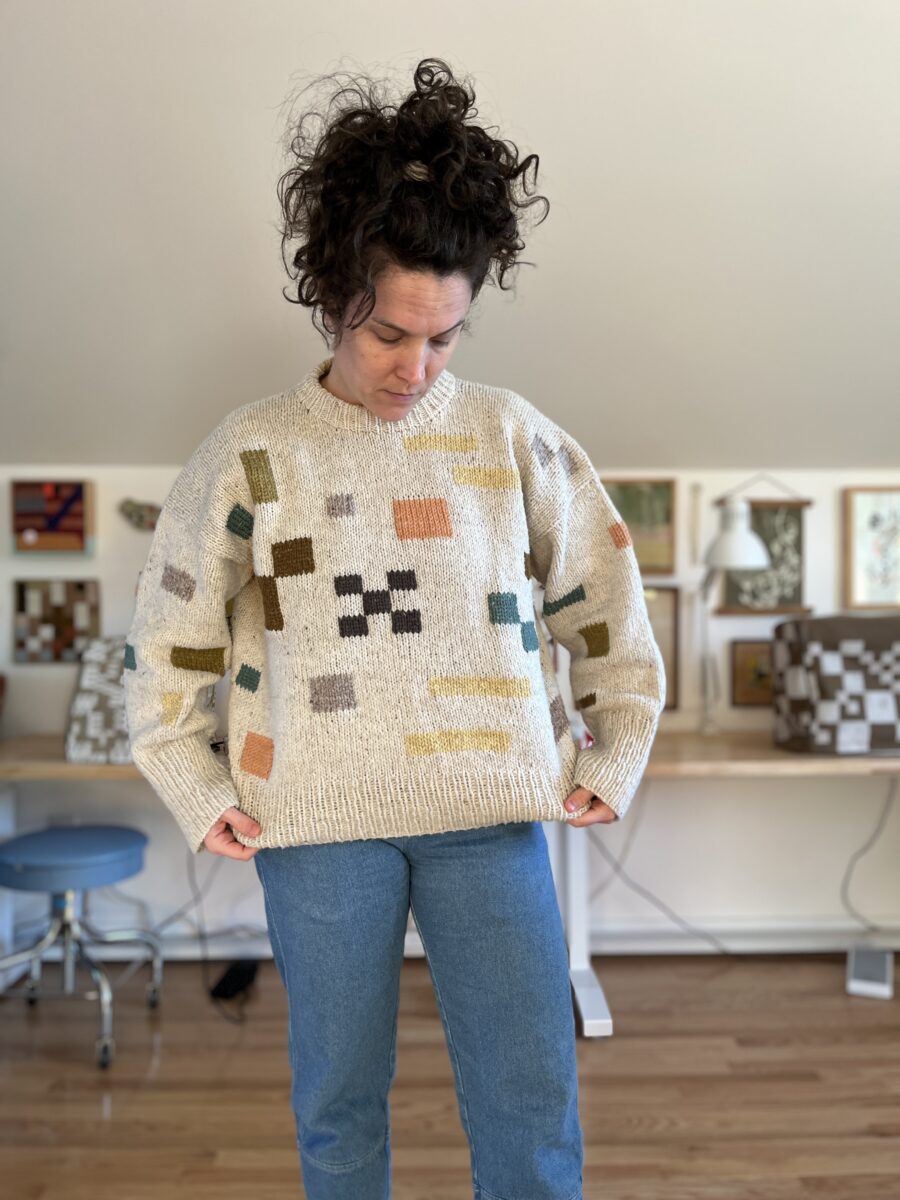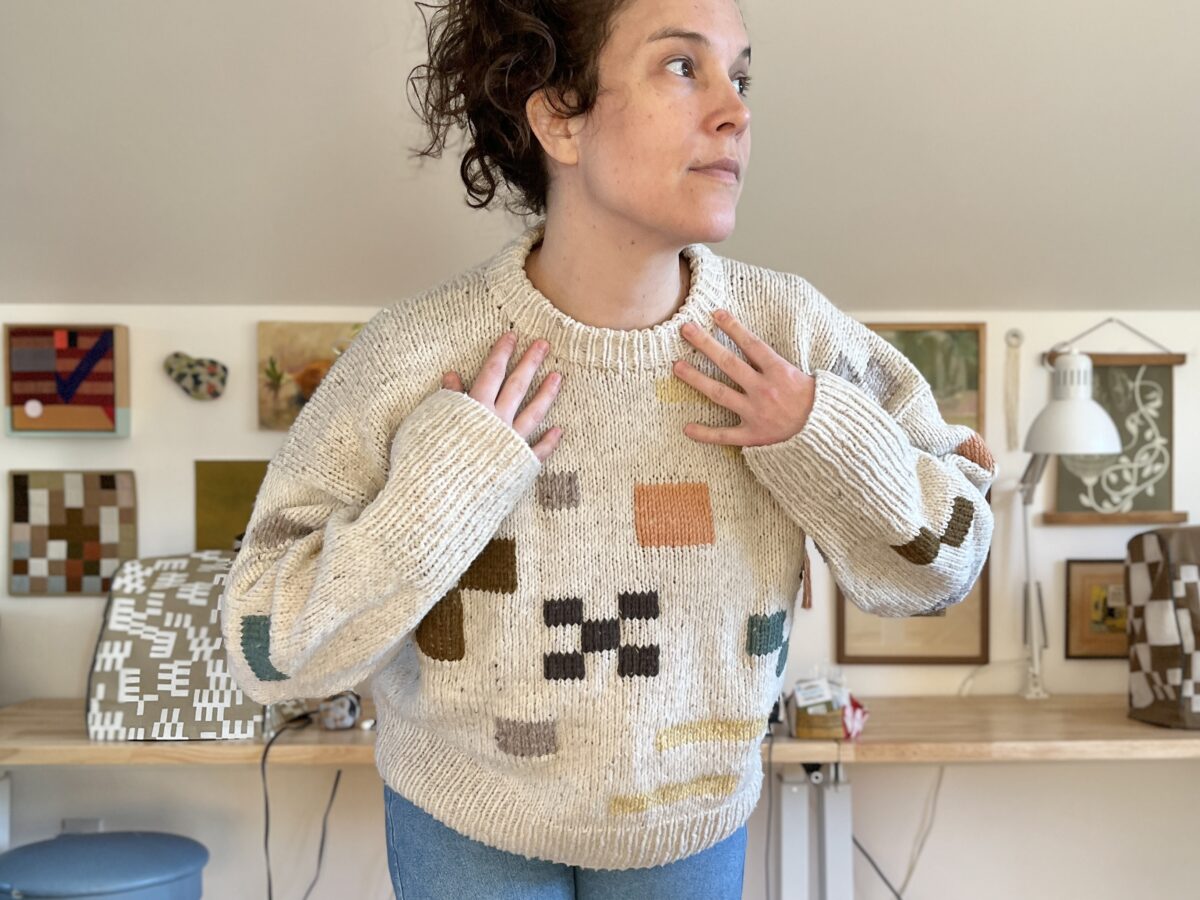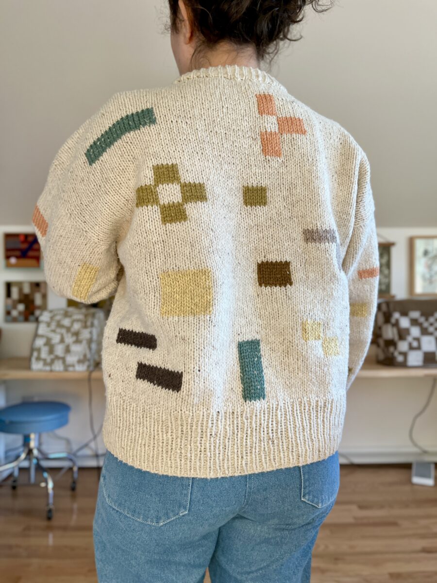 So with loads of leftover yarn, I slowly started adding some duplicate stitch shapes to see if it would hide the base color shifts, my unintentional row stripes, and make it something I’d actually reach for. I think it worked!