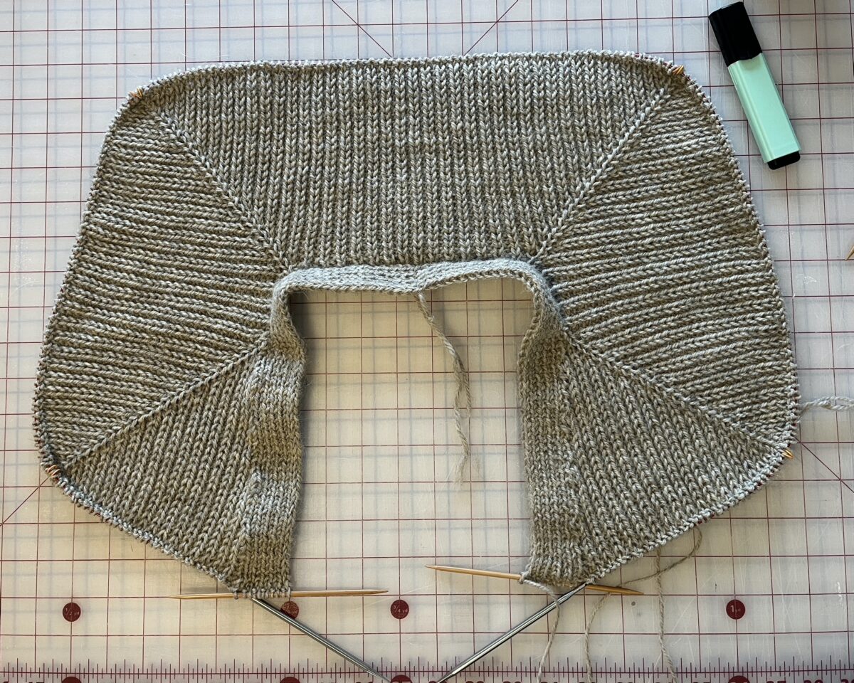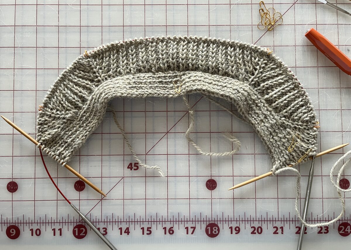 I am using US 9 needles for the body, US 8 for the ribbing, and did include the short rows on the back hem. I purchased 6 skeins of Noro and 6 skeins of mohair – I think I will have a decent amount leftover… Hoping I can finish it in December!